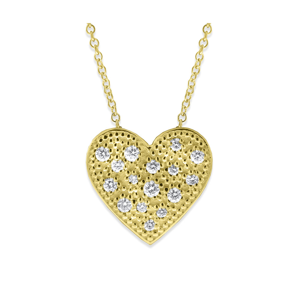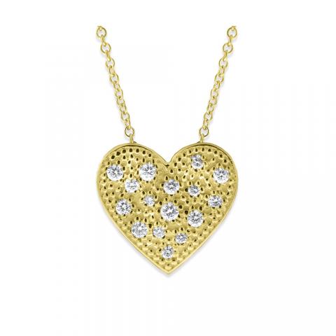 This gold and diamond heart shaped necklace has huge sparkle! Shown here in 14K yellow gold with 16 diamonds weighing .30 ct tw. Show off your BIG heart by gifting this necklace to a special lady, she is sure to love it.