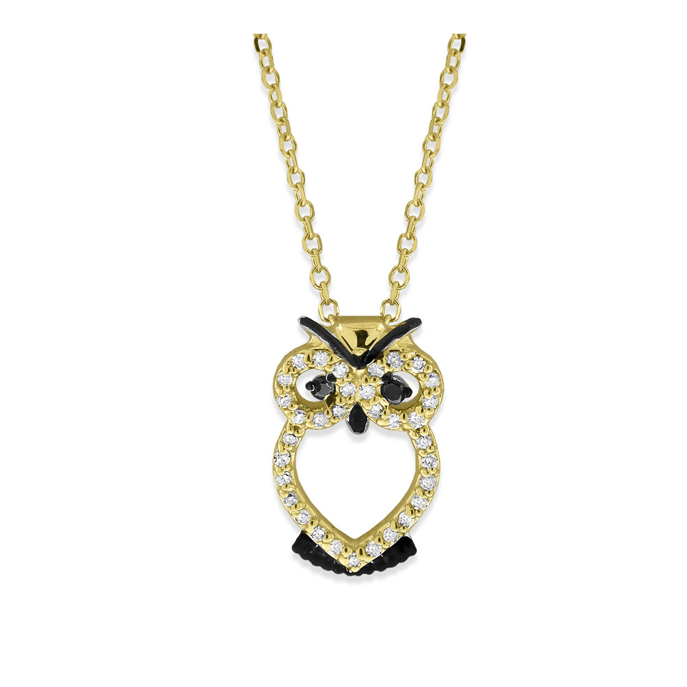 Black and White Diamond Owl Necklace in 14K Yellow Gold with 35 Diamonds Weighing .10 ct tw