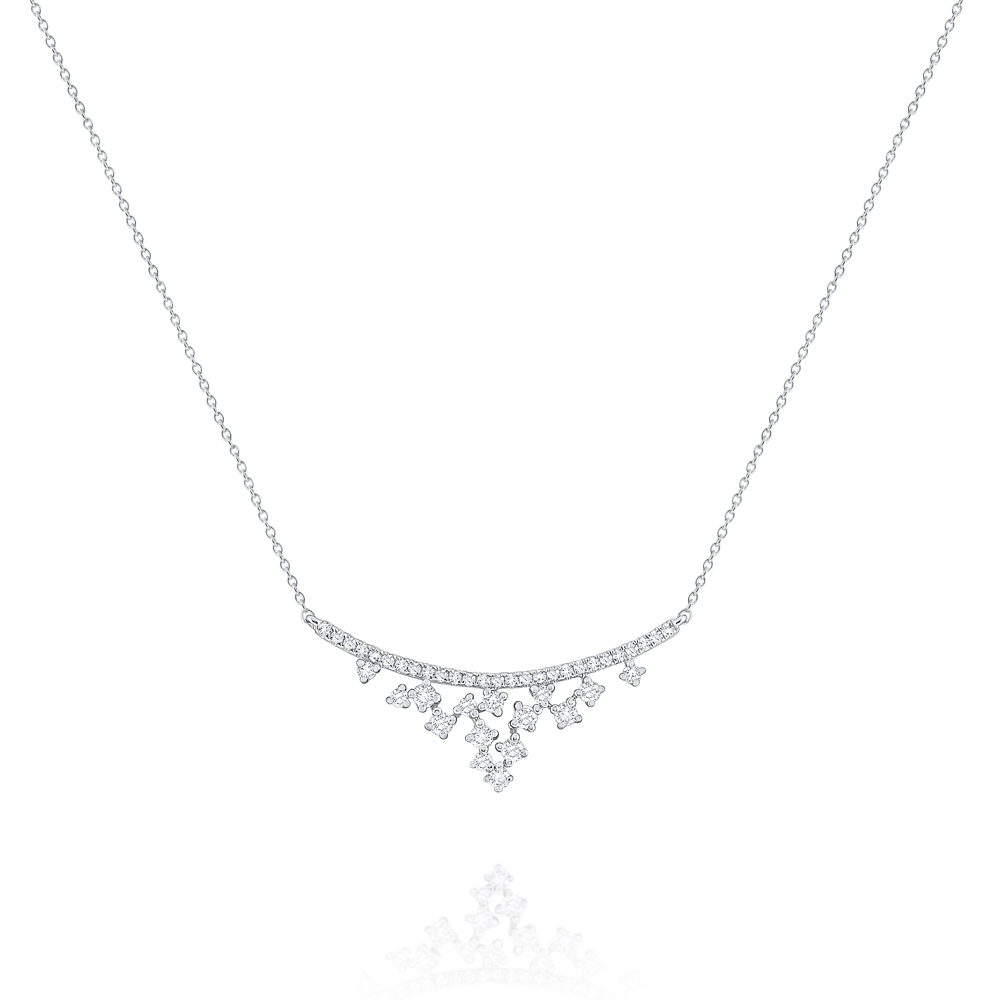 Feel like a princess in this romantic yet modern necklace. Sparkling round brilliant diamonds are lined up in a curve with additional diamonds cascading down from it in an elegant, ornate shape.