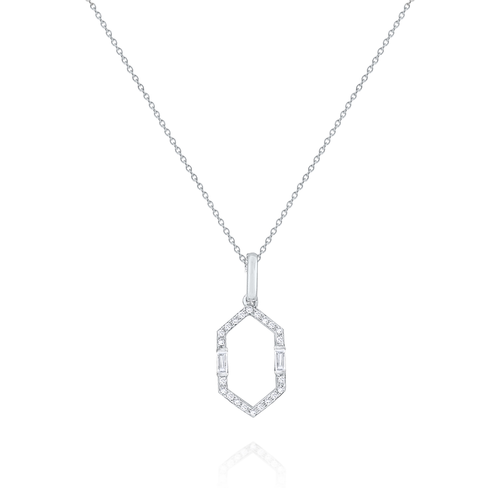 Part of KC Designs Mosaic Collection, this subtly modern pendant is made up of round brilliant & baguette diamonds. The octagonal frame shape evokes a contemporary yet classic style.