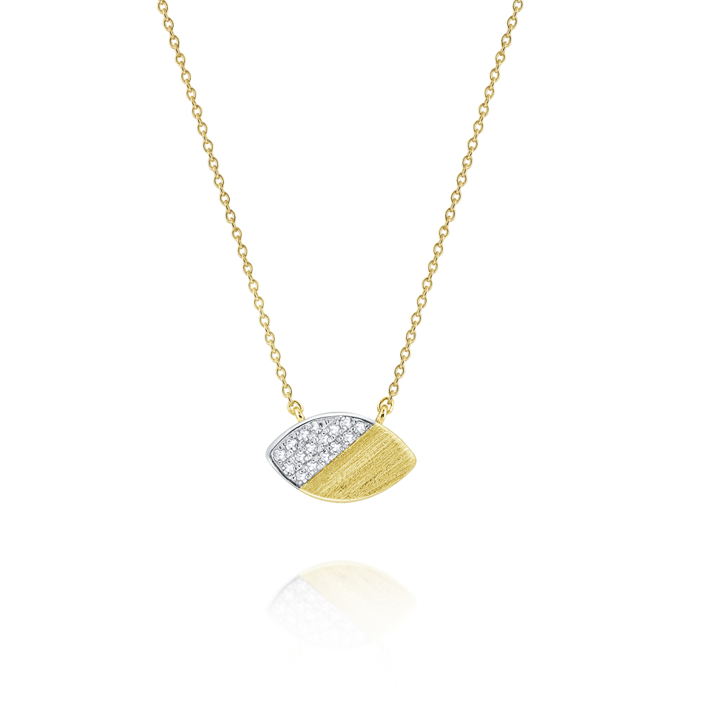 Pair this necklace with career or weekend wear for a fun & modern look. Pavé diamonds are set on half of the pendant while warm brushed gold shines on the other half, creating a soft satin finish.
