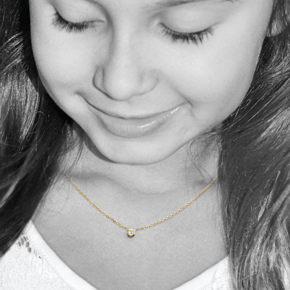 Cherish all the "firsts" in her life with the everlasting gift of sparkle...her first diamond. Available in 14k white, yellow and rose gold on a 16" Chain.