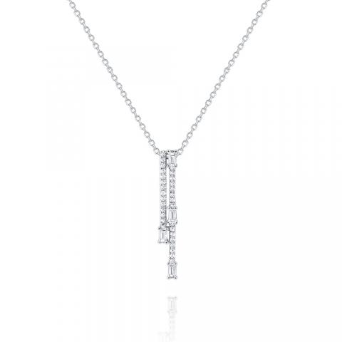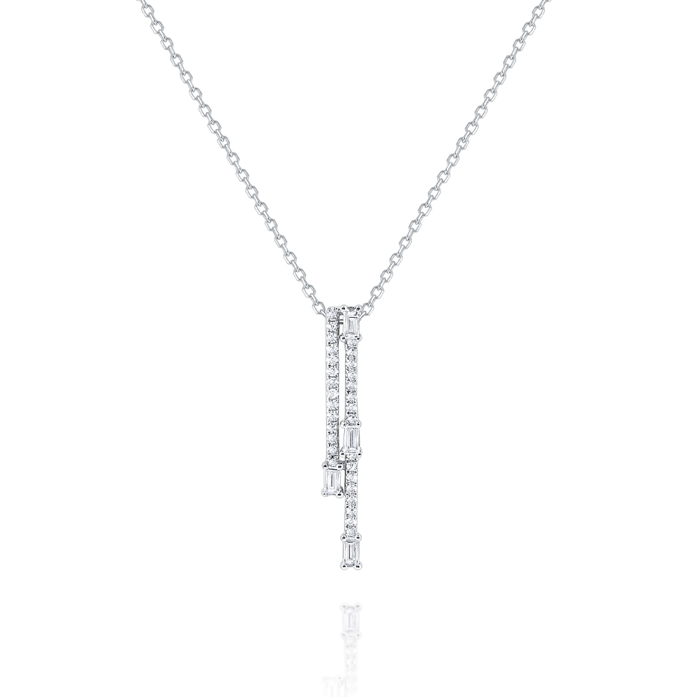 Light up your look with this airy and delicate necklace that is featured in KC Designs Mosaic Collection. Round brilliant diamonds are offset by a sprinkling of shining baguette cut diamonds, creating a fun, floating effect. You can wear it to the office or after-hours with ease and style.