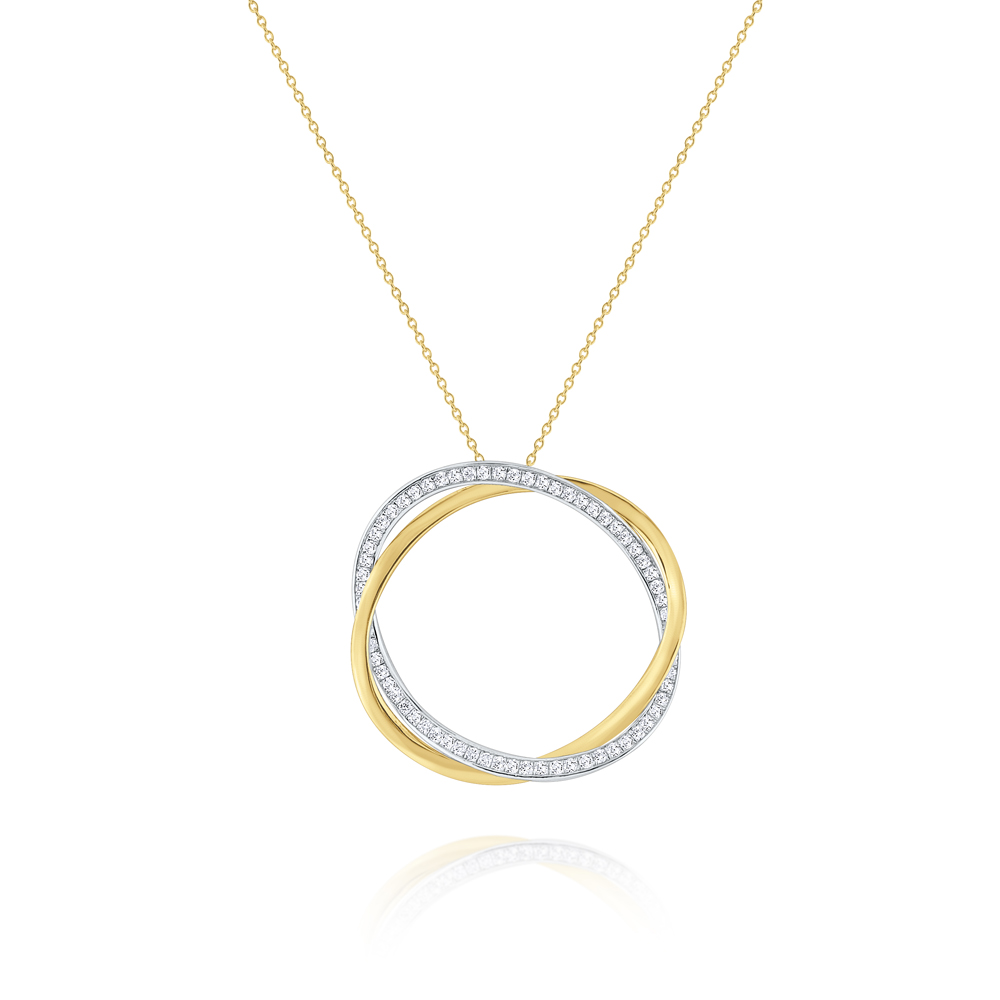Dare to dazzle with this unique pendant. Shining gold & sparkling diamonds are intertwined in an elegant, sophisticated fashion. You’re sure to get a lot of compliments with this modern pendant!