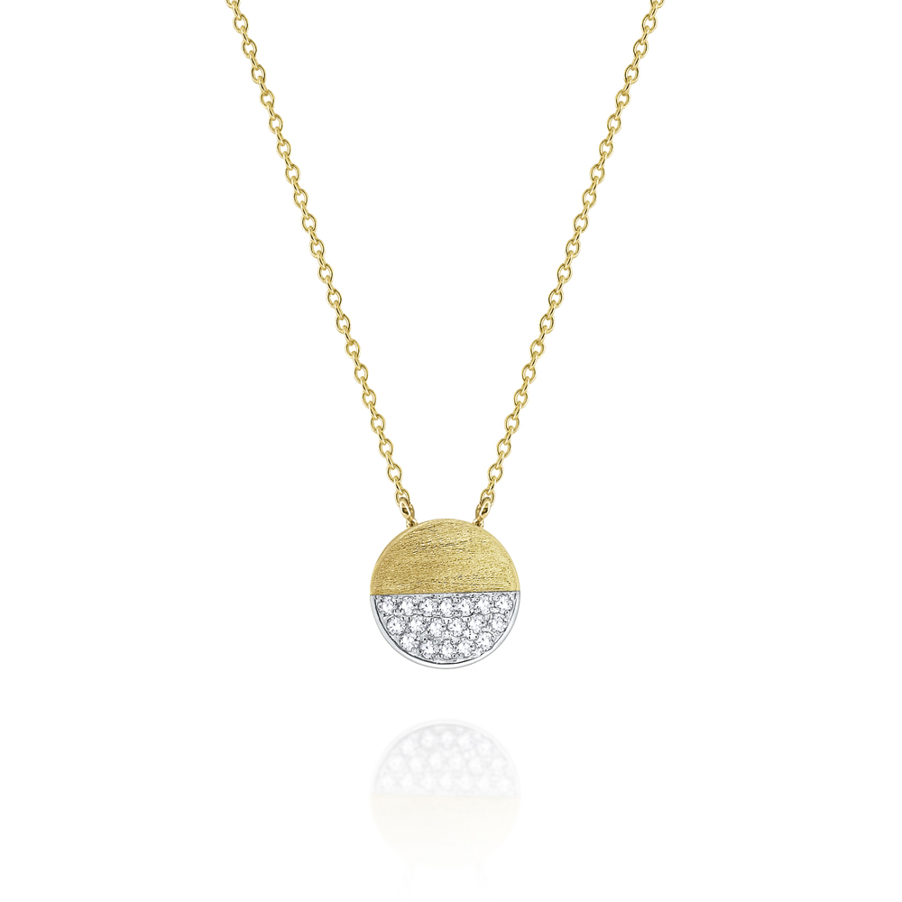 Brushed Gold and Diamond Pavé Half Circle Disc Necklace Set in 14 Kt. Gold
