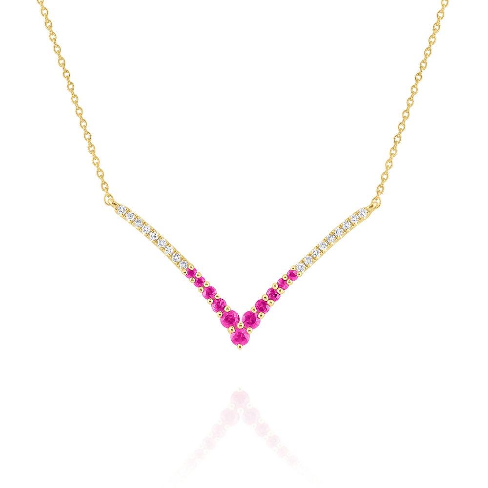 Celebrate color with this graceful necklace! Pretty pink sapphires & diamonds glimmer in a V shape that sits daintily between your collarbones.