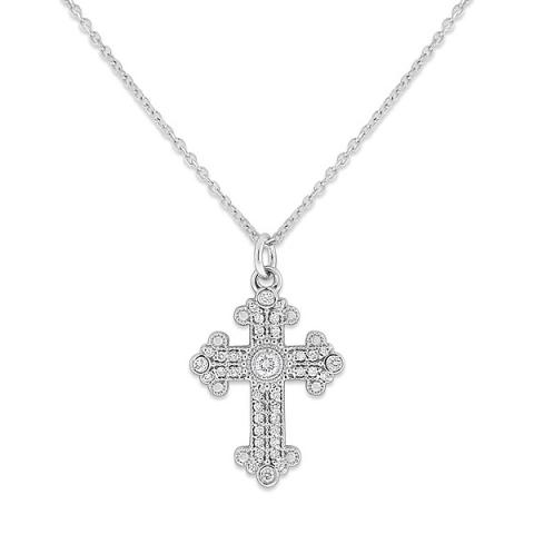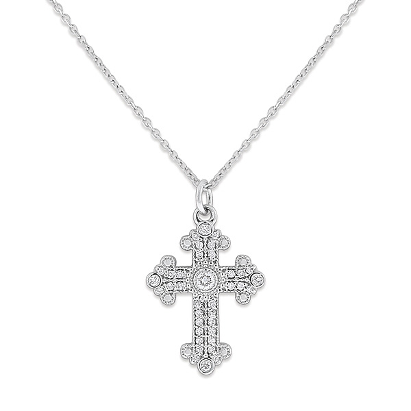 Let the world know how you feel about your faith with this sweet and charming diamond medium cross necklace. This gorgeous necklace will symbolize your commitment to God and will dazzle with 37 twinkling .18 ct tw diamonds. This elegant piece of jewelry is pictured here in 14 k white gold.