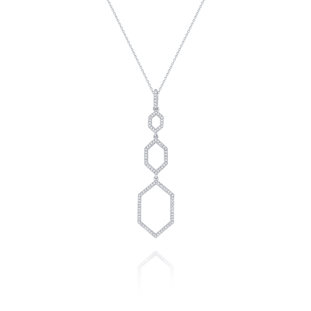 Dare to dazzle in this open-worked geometric pendant. Perfect for your favorite low cut top or swing dress! Three hexagonal shapes are lined up in order of size.