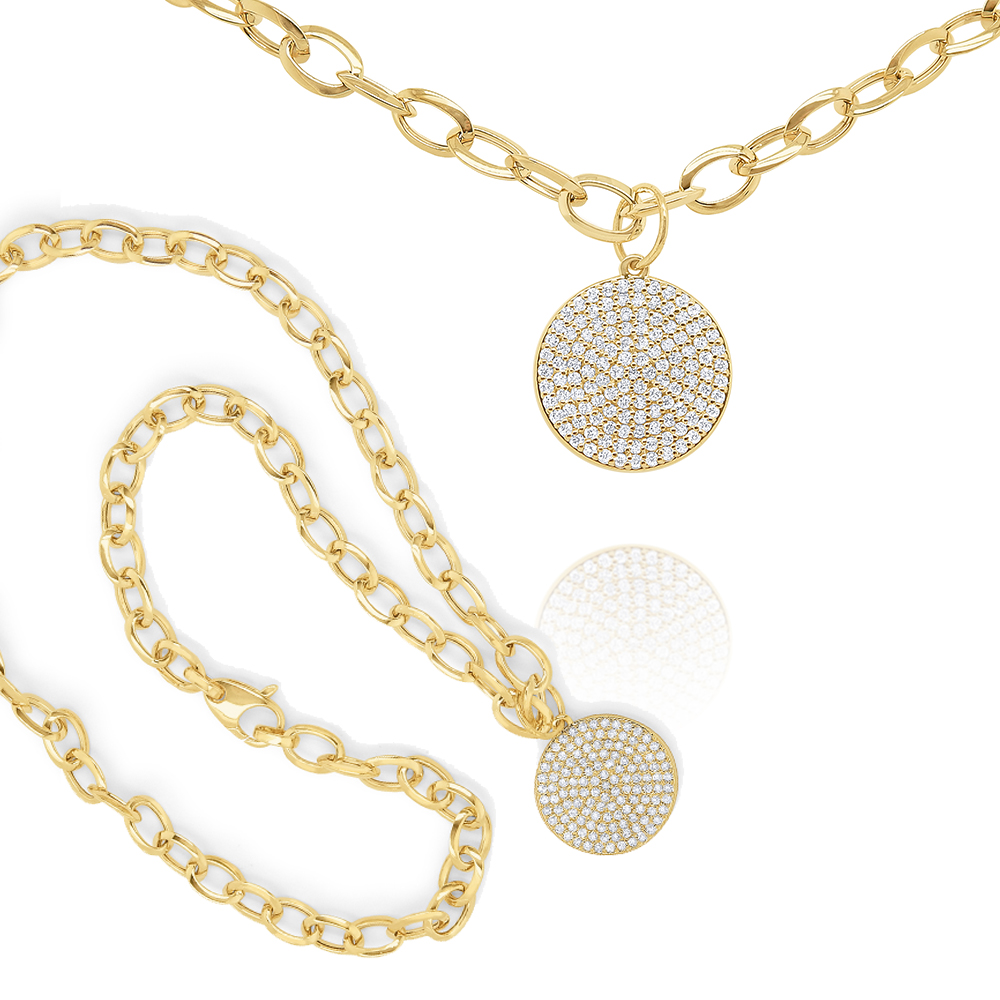 A classic large pave diamond disc shines on a stunning gold link chain.