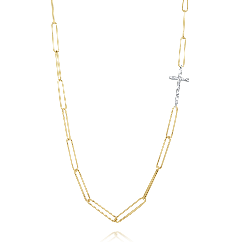 A new take on the side cross necklace. We've added a light paperclip chain in 24" long. Wear solo or layer it up.