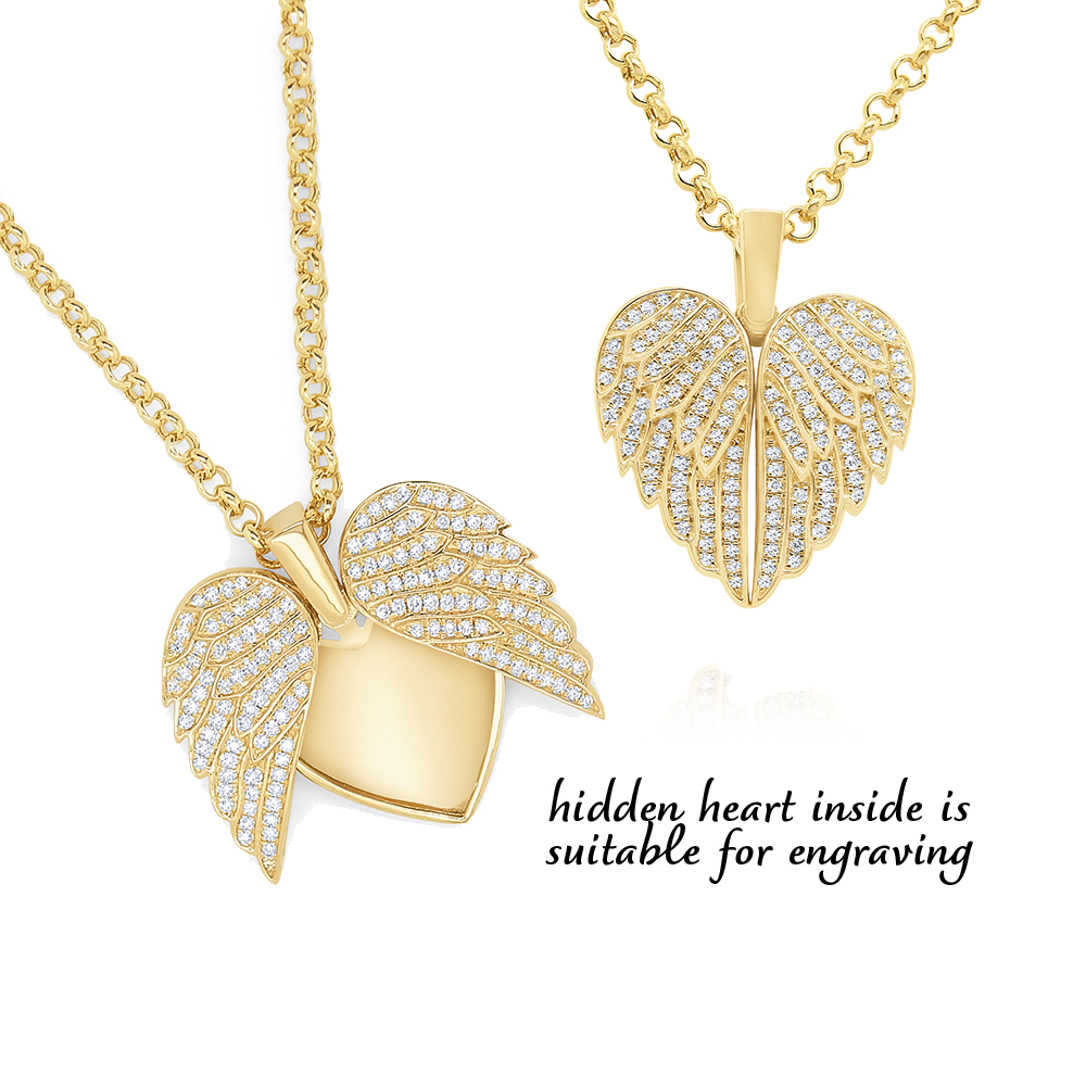 Hold the memory of a loved one in this beautiful angel wing heart locket. The wings open to reveal a hidden heart for engraving or to hold a photo of a loved one.