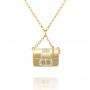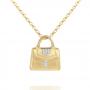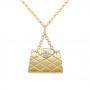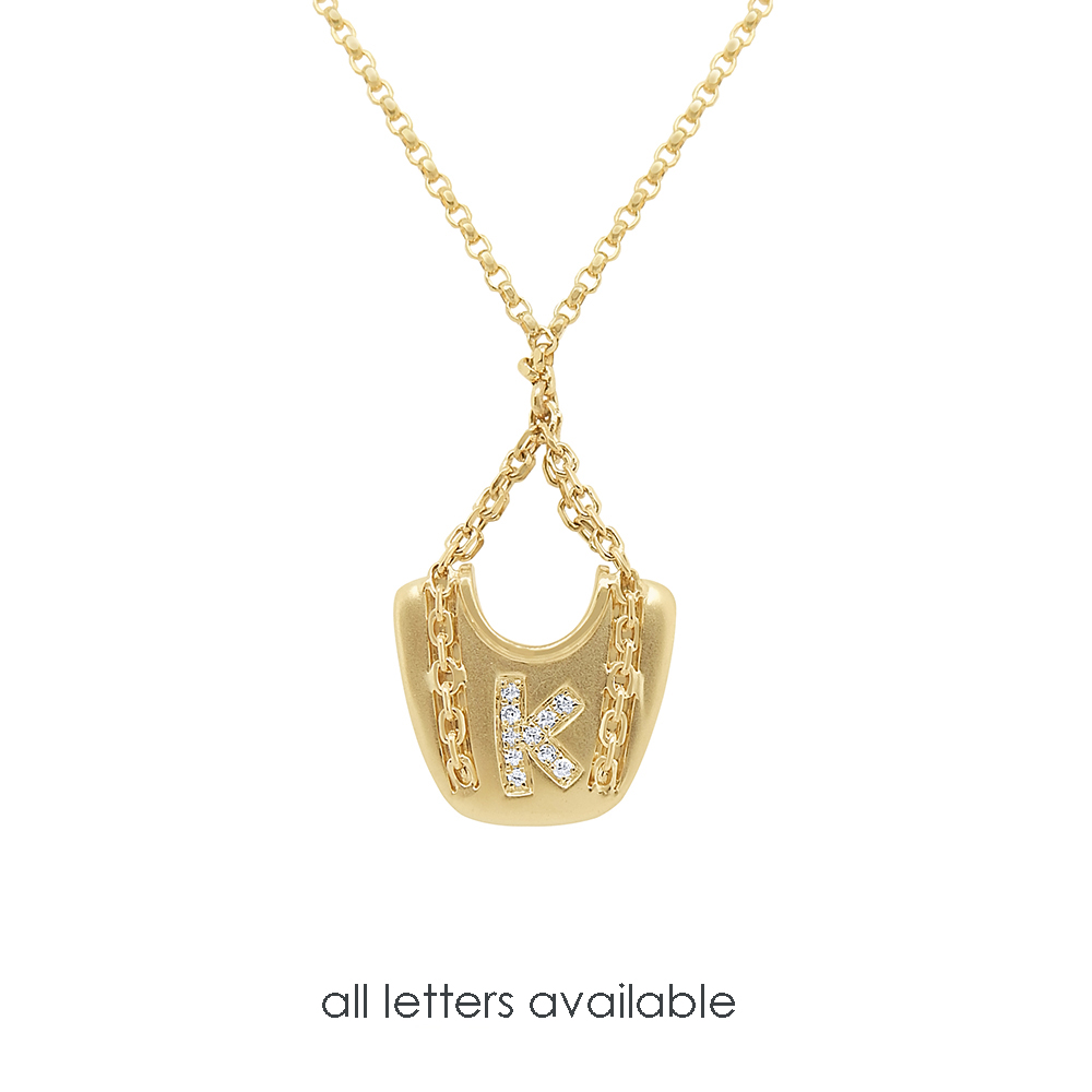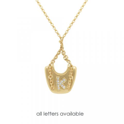How adorable! This golden handbag is just charming, complete wth a diamond intial of your choosing. Chain is adjustable 16-17-18".