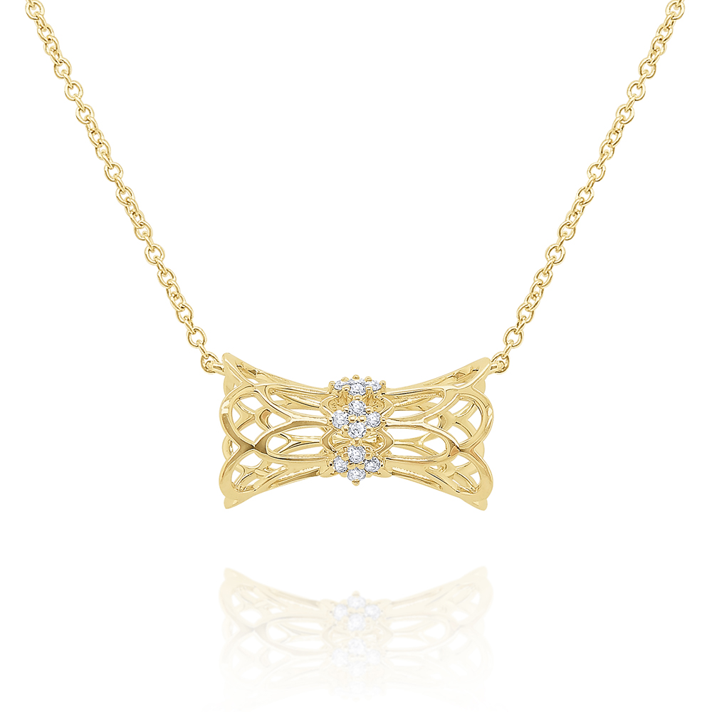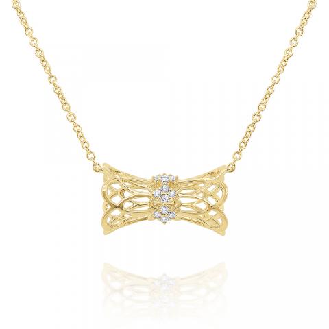 An open lacy design accented by diamonds make up this modern barrel necklace. The chain is adjustable - 16,17,18".