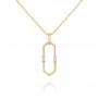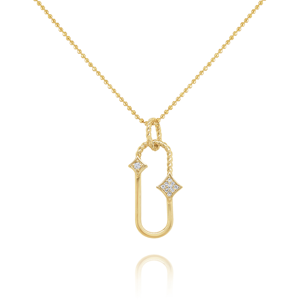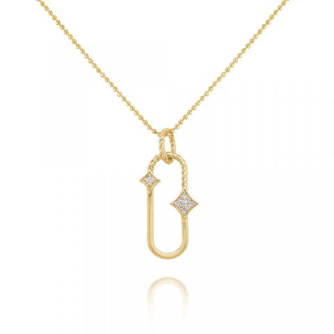 A simple geometric shape with diamond accents hangs on an 18" bead chain. Perfect for layering.