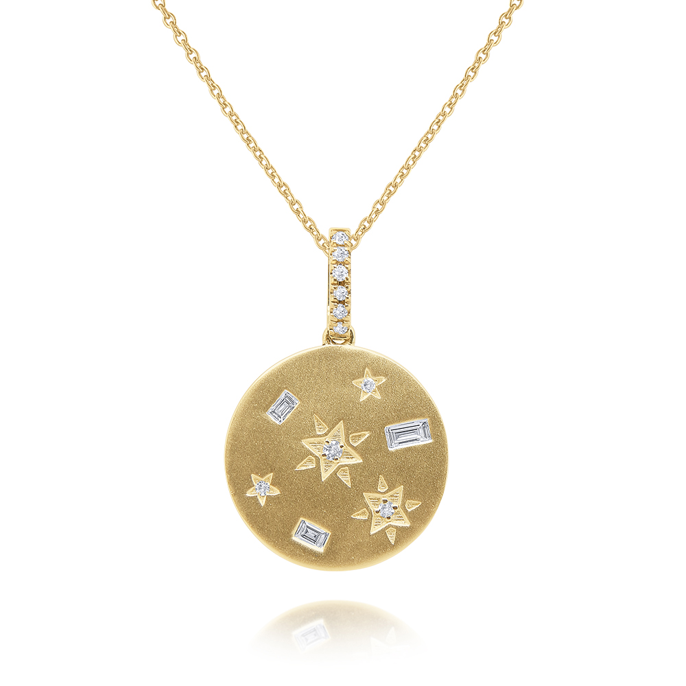 Starlight, starbright! Round and baguette diamonds are set in a gold disc with a soft matte finish. Perfect for layering with your other celestial favorites.