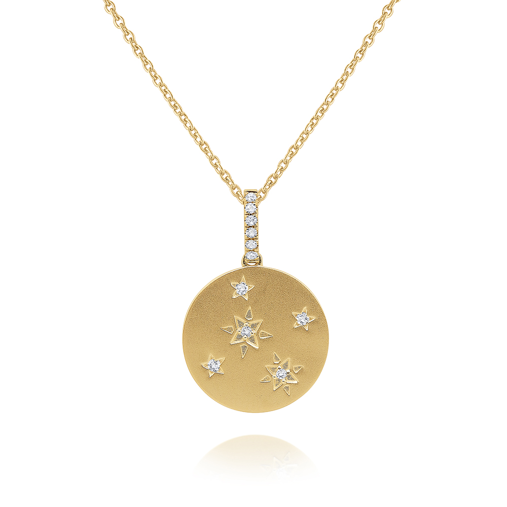 Diamonds set in a matte gold disc sparkle bights like stars int eh night sky. Wear with your other favorite celestial jewels.