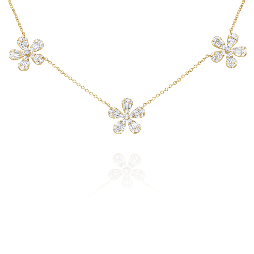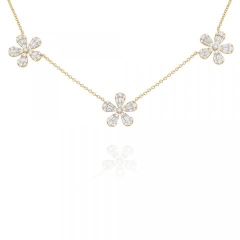 Gold and Diamond Baguettes make up this stunning triple flower necklace. Chain is adjustable from 16-17-18".
