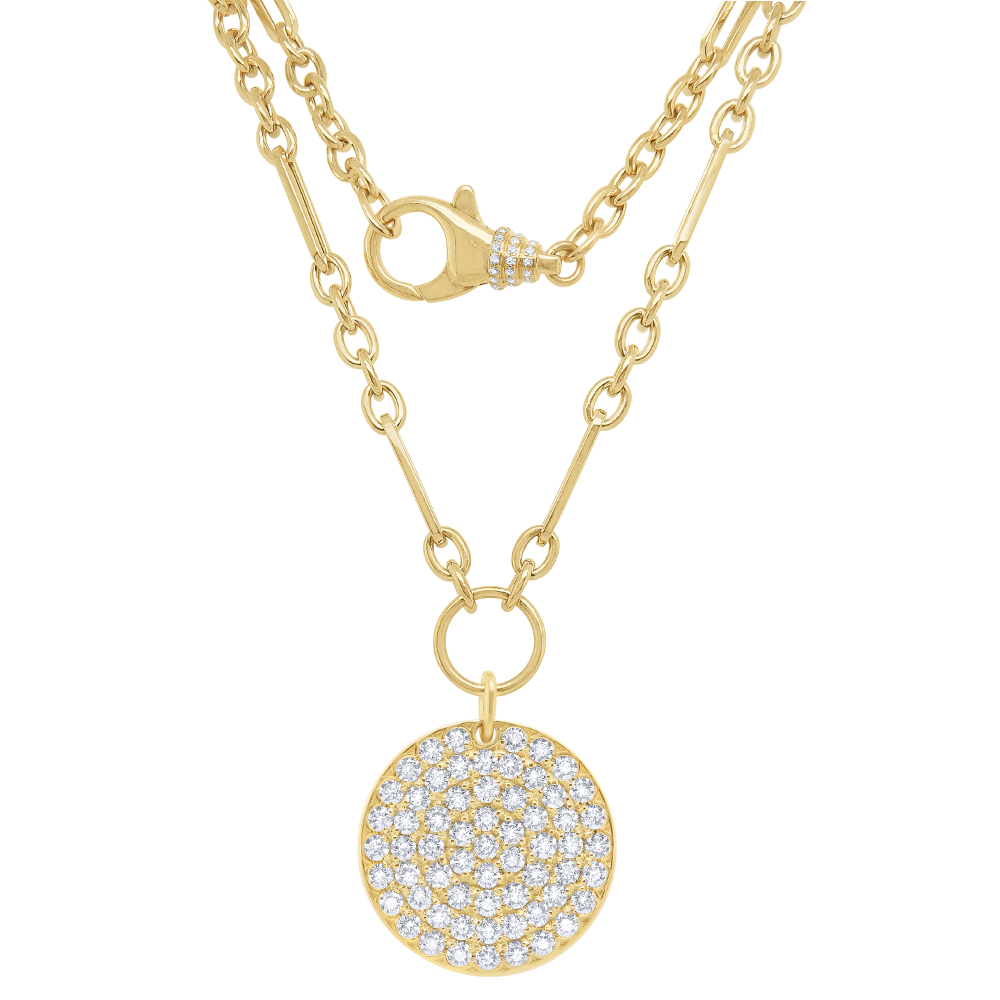 One word describes this necklace.....STUNNING. Turn heads with this gold and pave diamond disc necklace. We've also added some surprise sparkle in the back....