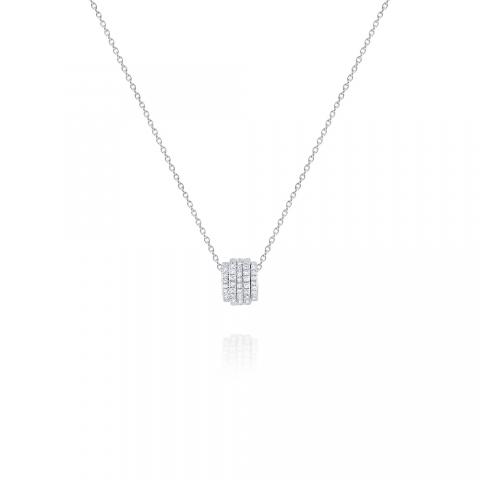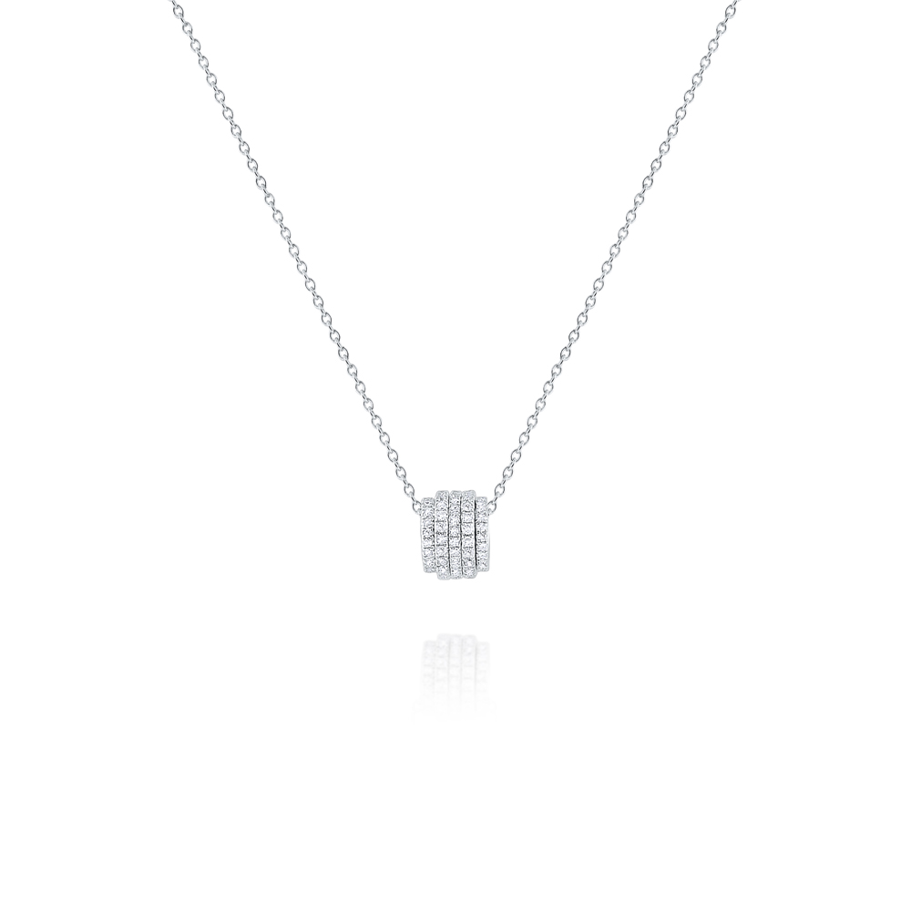 Shimmering diamonds play on this movable roller pendant. 5 rings of diamonds move on their own to create a dynamic slider that is sure to get many compliments!