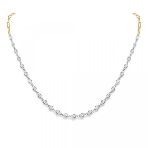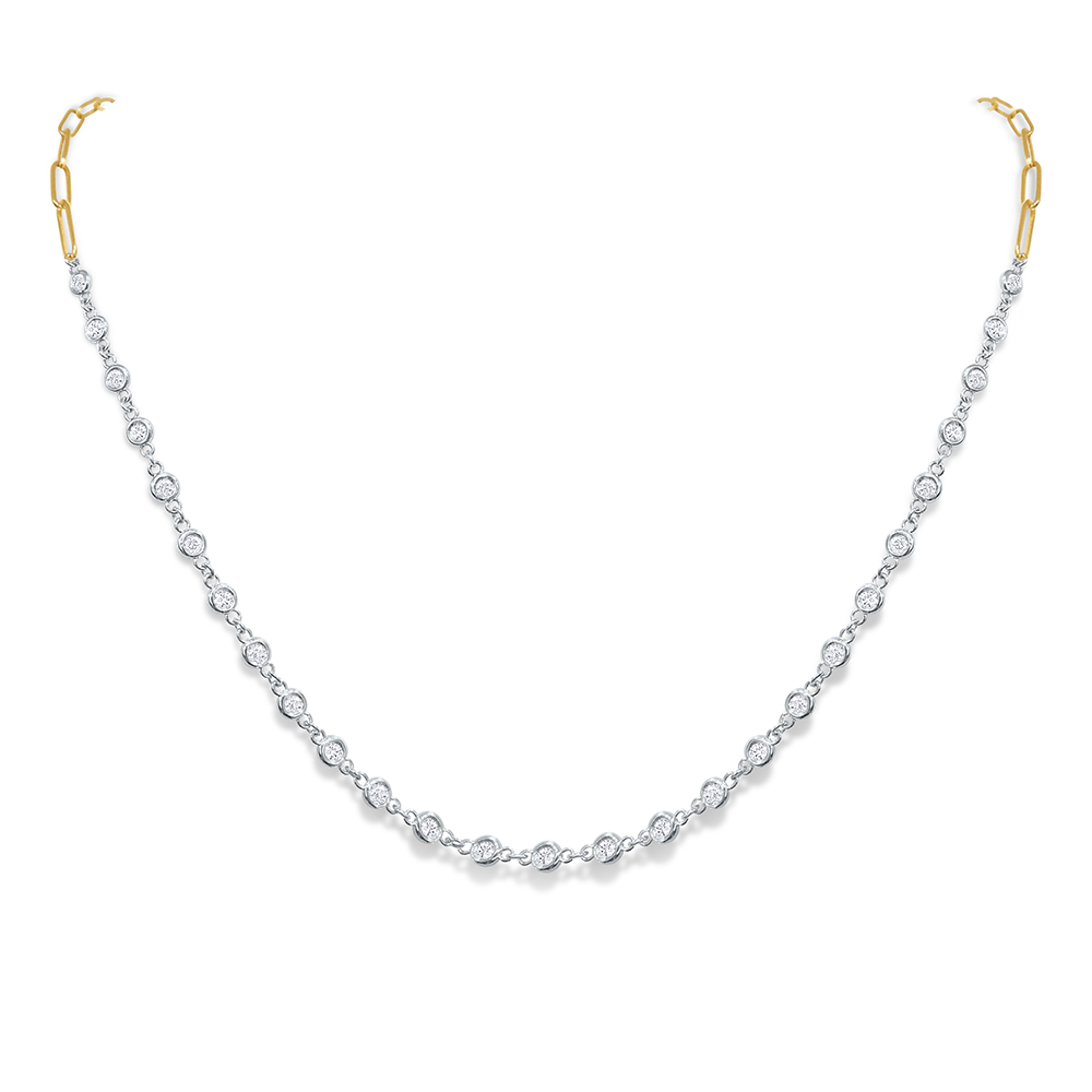 A modern take on a classic style. A continuous diamond row is connected to a golden paperclip chain that wraps around the back of the neck.