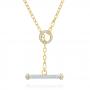 A pave diamond toggle connects to an 18" golden paperclip chain. Create two different looks with the toggle hanging in the center or off to the side.