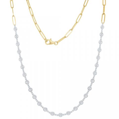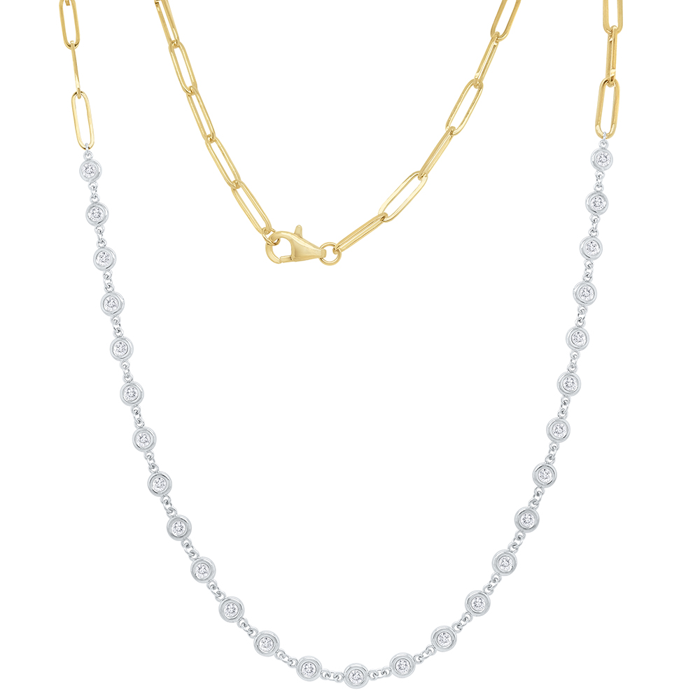 A modern take on a classic style. A continuous diamond row is connected to a golden paperclip chain that wraps around the back of the neck.