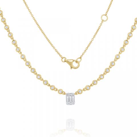 A modern twist on a classic design. A baguette pendant sits between a continuous diamond row that then transitions into an adjustable 15-16-17" chain.