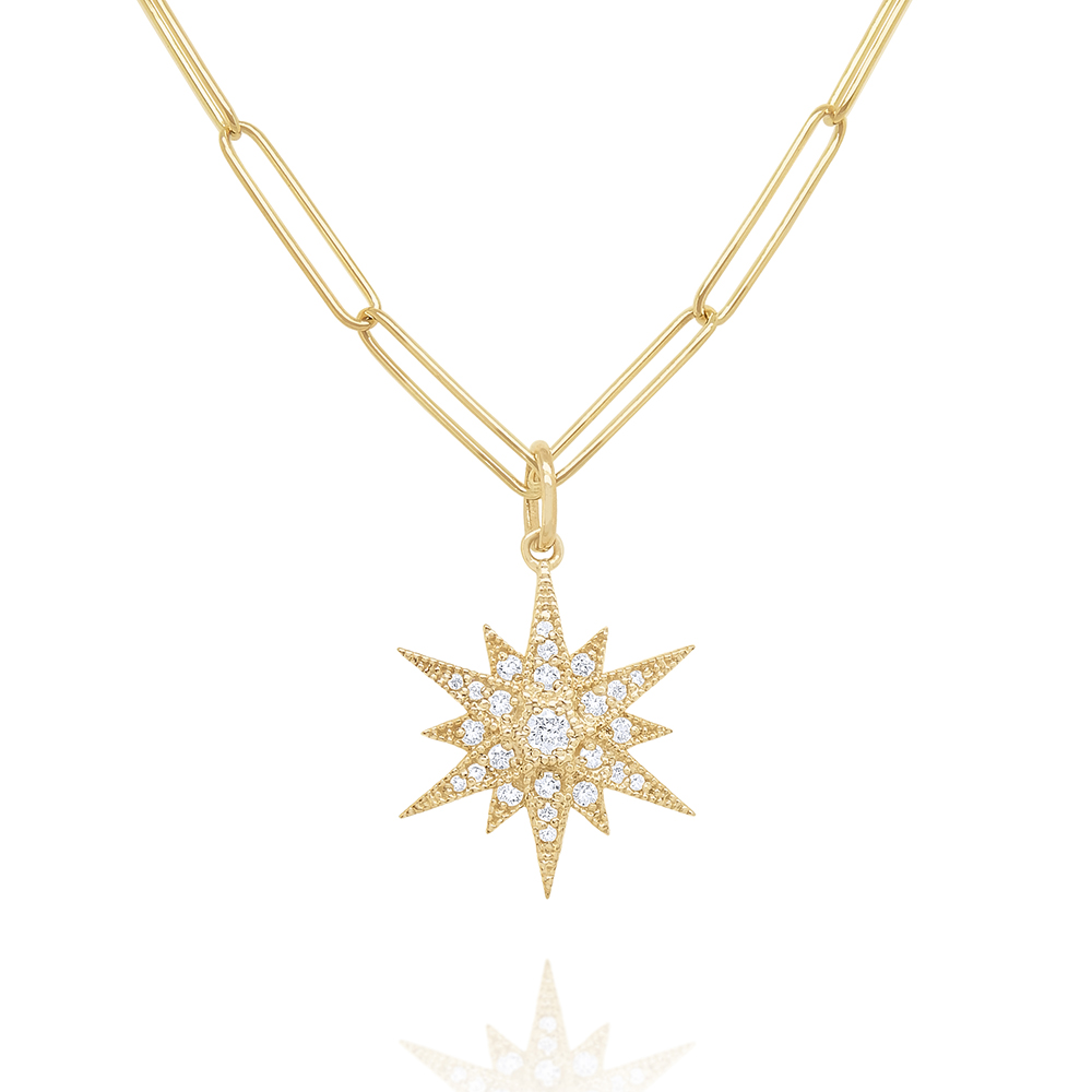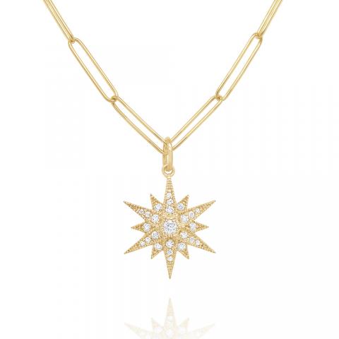 Diamonds dazzle in this sparkling starburst pendant on an elongated 18" adjustable paperclip link chain.
