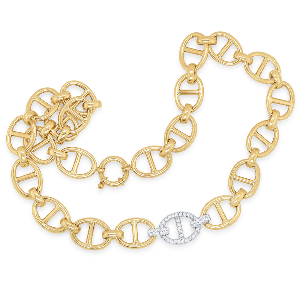 A diamond pave link is held by a stunning bold mariner chain. Pair with the bracelet B5881 to complete thw look.