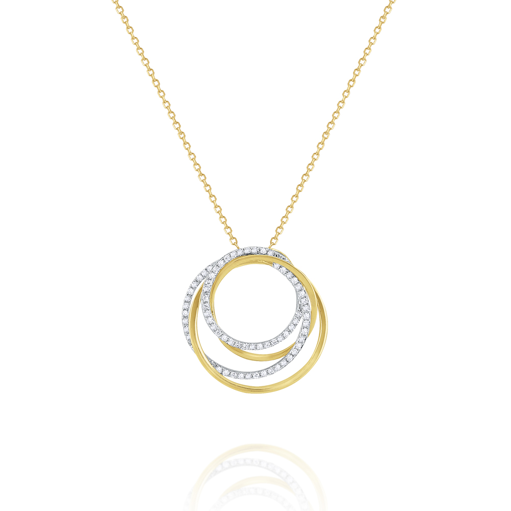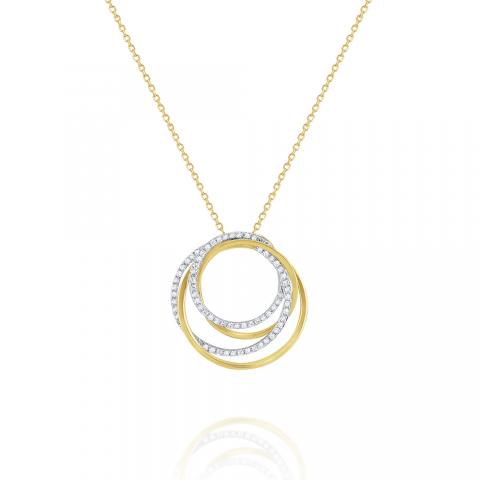 Show off your contemporary style with this chic necklace. Rings of glittering diamonds are intertwined with shining gold to create a dynamic feeling of movement. Wear it with matching earrings for a complete look.
