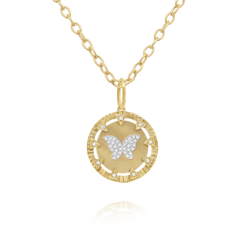 A sweet diamond butterfly sparkles and shines in this modern medallion necklace. Chain is 18".