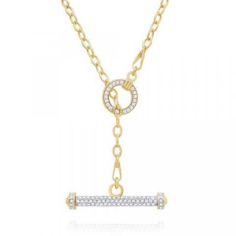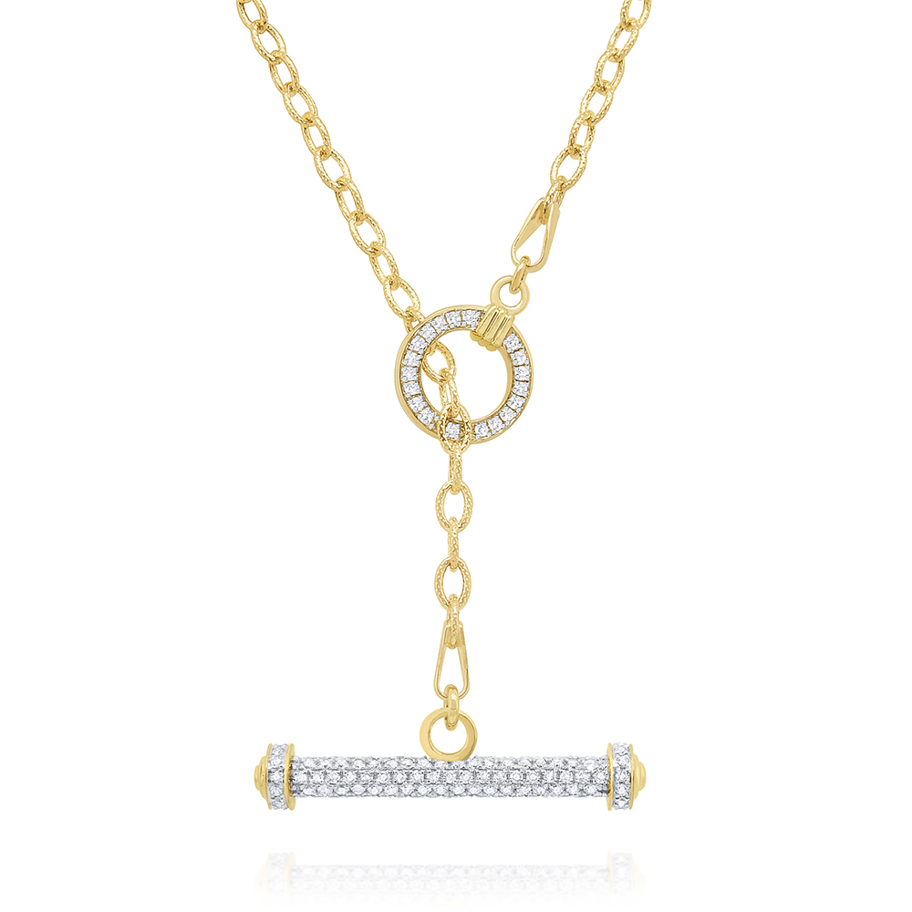 A classic diamond toggle loops through a diamond pave circle to create this bold and trending necklace. Chain length is 24".