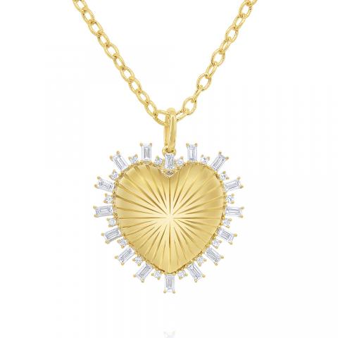 Engraved rays of light enamate from the center of this beautiful goldern heart. 32 dazzling diamonds frame the shape adding more sparkle and shine. Chain is 18".