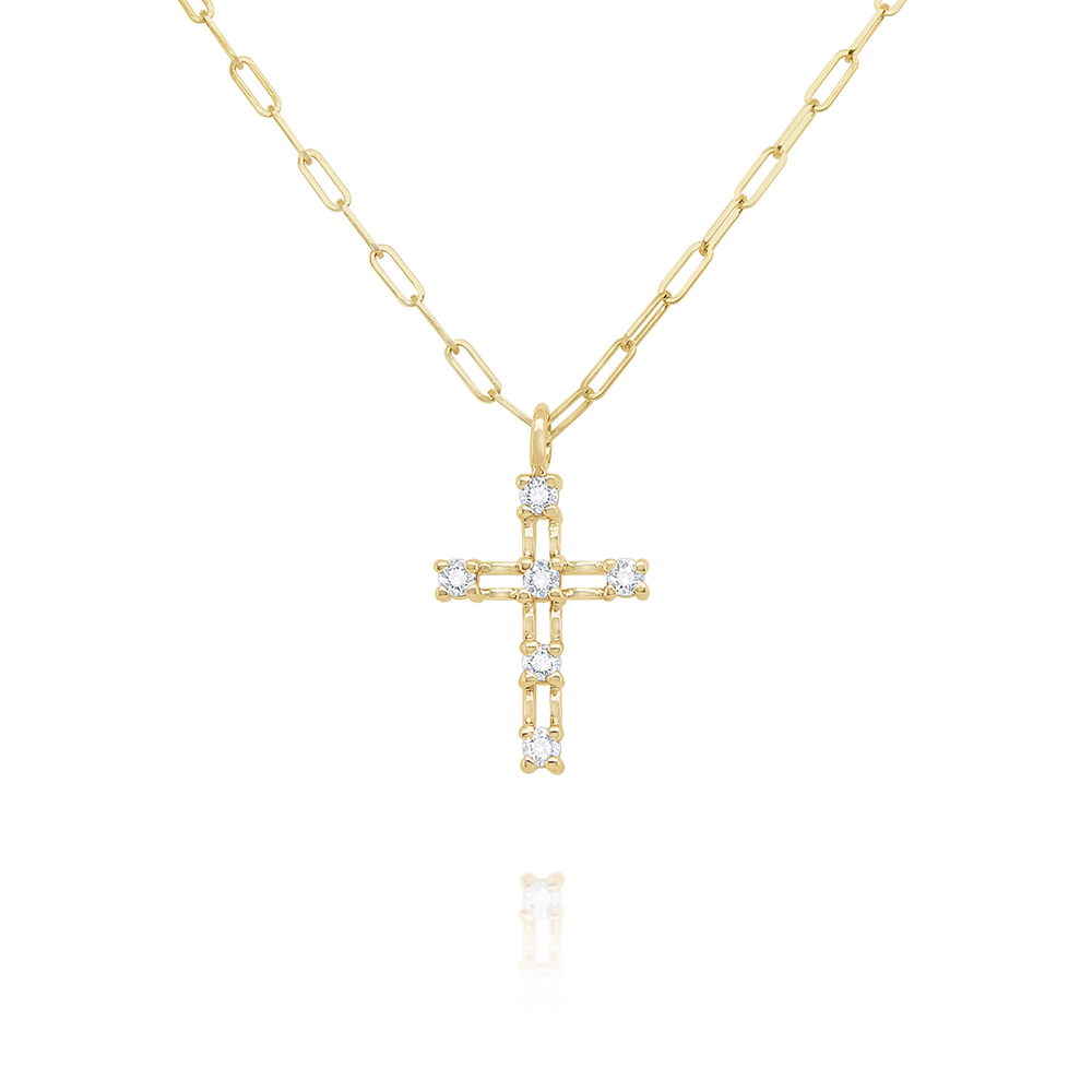 Four golden bars hold six sparkling diamonds to form this simple diamond cross, perfect for a littel everyday faith. Paperclip chain is 18".