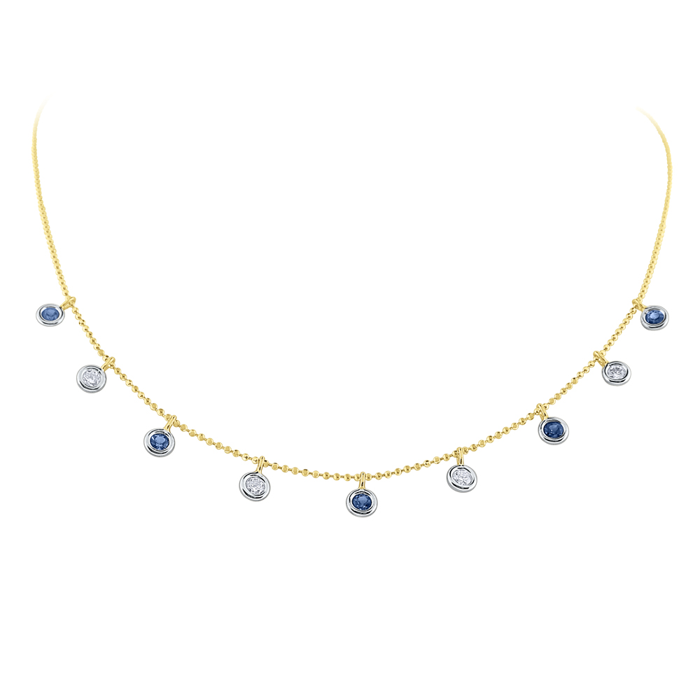 Pastel blue sapphires are sweet like candy as they shine from a 14 kt. gold ball chain that is perfect for layering. Glittering bezel set diamonds are offset with sapphires to add a pop of cool color to your look.