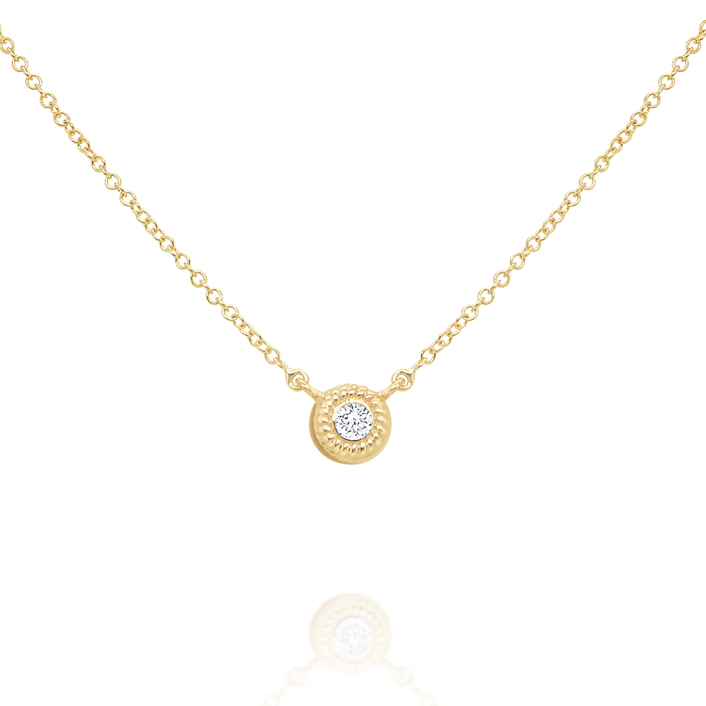 A single diamond is set in a braided gold bezel...it's the perfect everyday necklace to add just a little sparkle to your style.