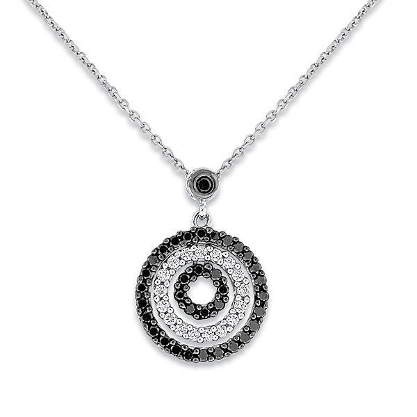 The dark and dramatic design of this black and white diamond circle necklace will hypnotize you and dazzle you with its beautiful intricacy. It contains 52 shimming .42 ct tw diamonds that are set within a complex and fascinating pattern. This exquisite little work of art is shown here in stunning white gold and dramatic black rhodium.