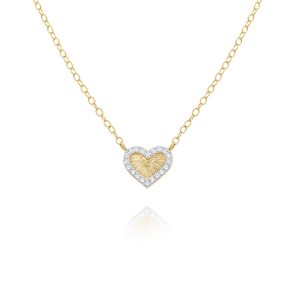 Shimmering diamonds frame a petite golden heart engraved with sunrays. Perfect for just a touch of sparkle.