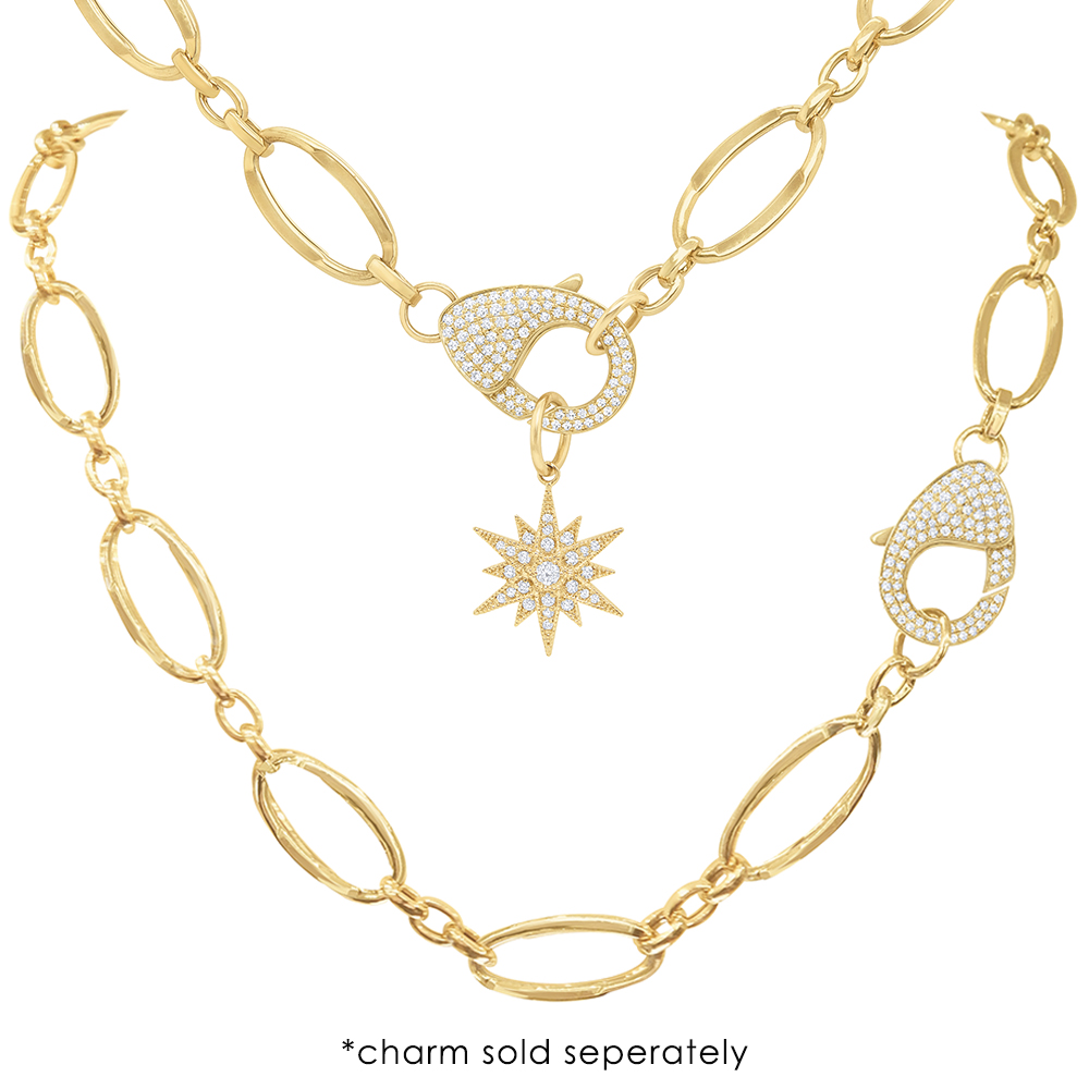 A stunning bold link chain with a large double sided pave lock can be worn centered in the front or off to the side. Personalize by clipping on your favorite charms. (Charm in image sold separately).