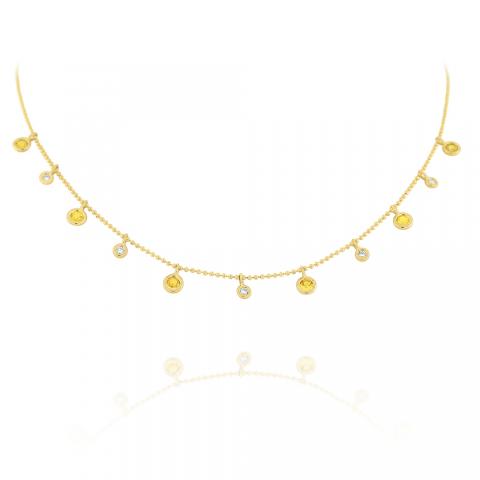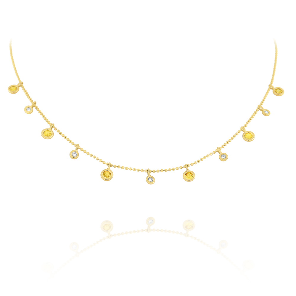 Warm yellow sapphires are sweet like candy as they shine from a 14 kt. gold ball chain that is perfect for layering. Glittering bezel set diamonds are offset with sapphires to add a pop of fun color to your look.