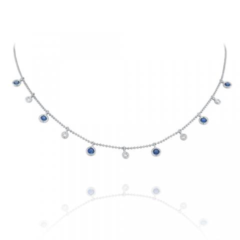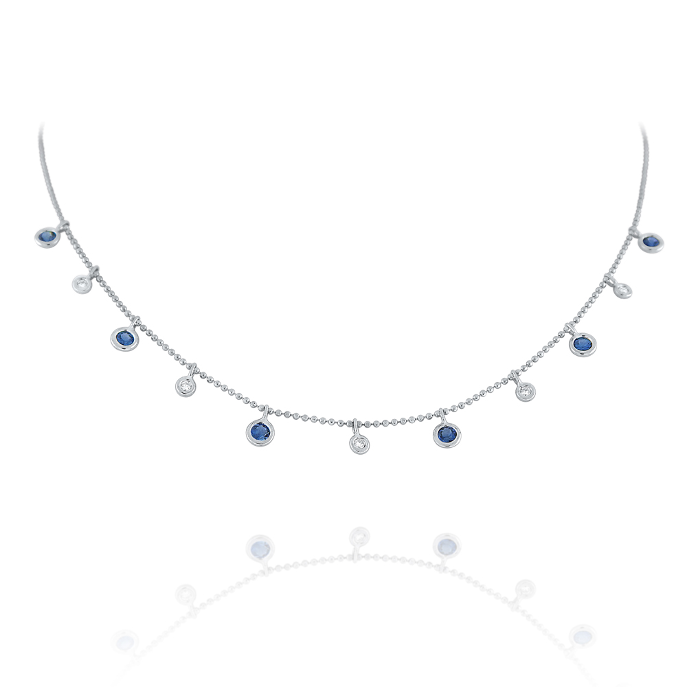 Cerulean blue sapphires are sweet like candy as they shine from a 14 kt. gold ball chain that is perfect for layering. Glittering bezel set diamonds are offset with sapphires to add a pop of cool color to your look.