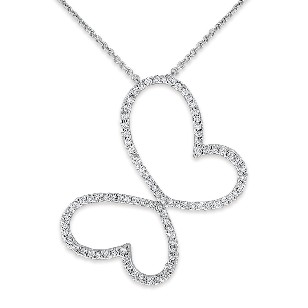 Two diamond hearts form wings to create this modern butterfly pendant on an adjustable 16-18" chain.