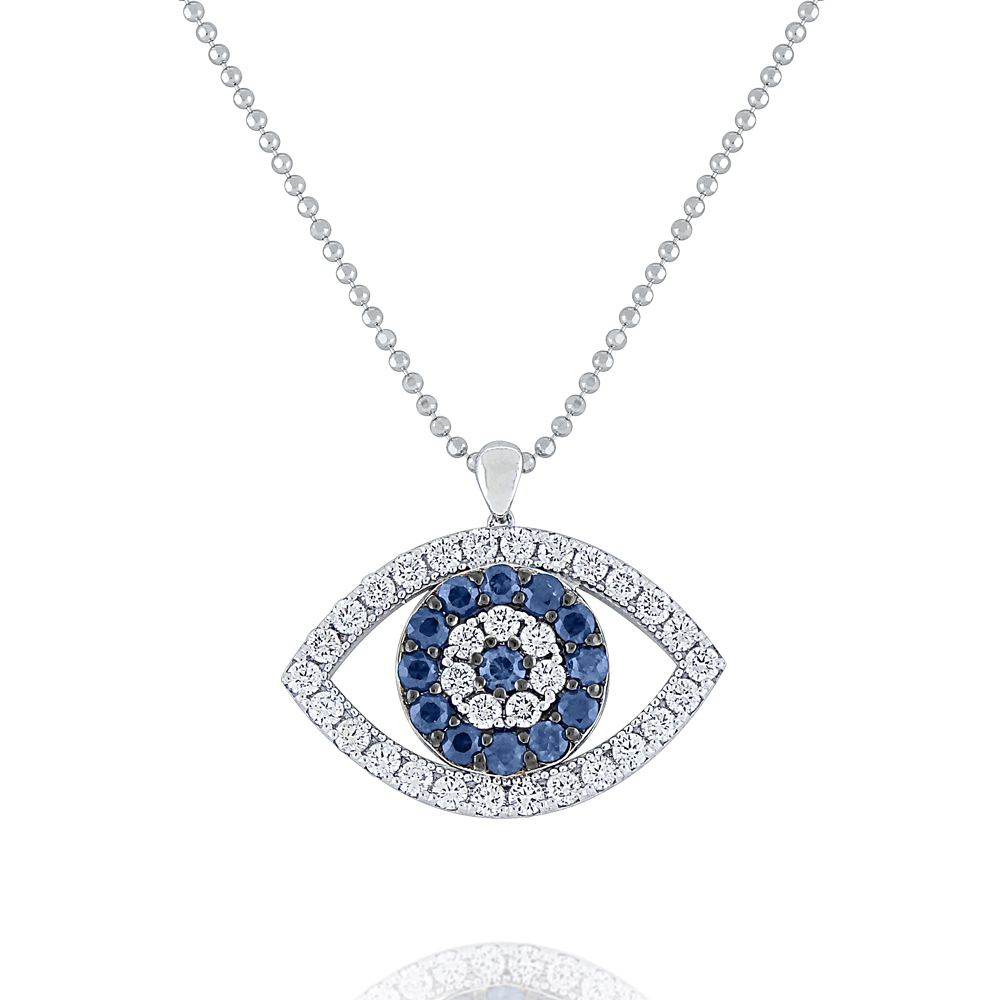 The cerulean blue sapphires & sparkling diamonds in this pendant is meant as potent in deflecting the evil eye. This colorful necklace carries a lot of significance!