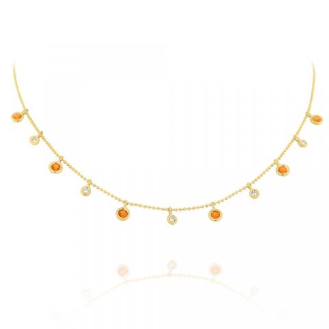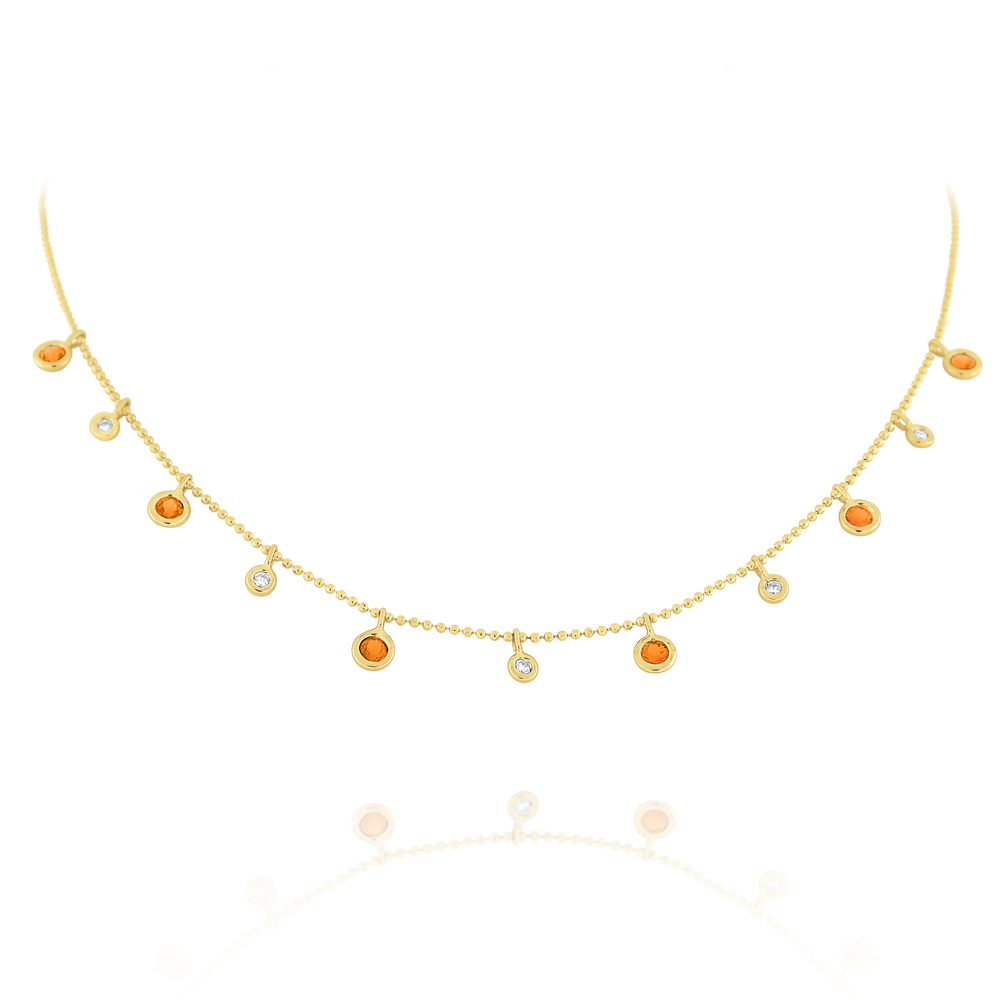 Fiery orange sapphires are sweet like candy as they shine from a 14 kt. gold ball chain that is perfect for layering. Glittering bezel set diamonds are offset with sapphires to add a pop of fun color to your look.