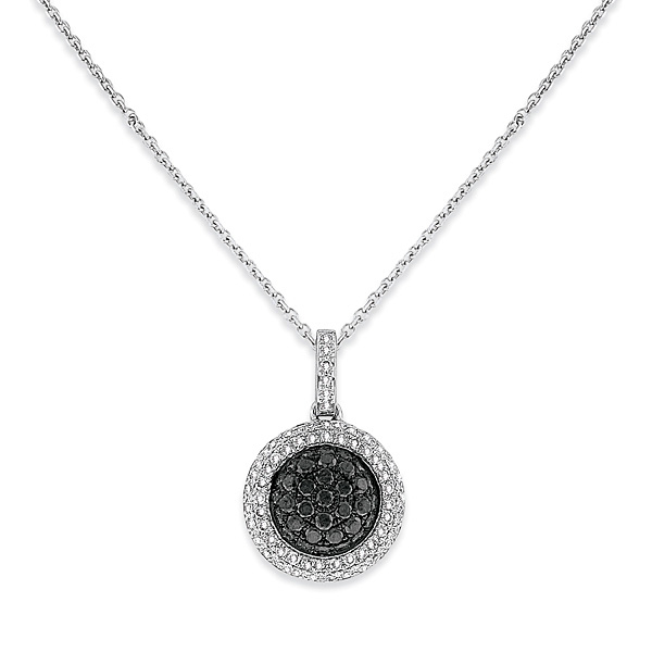 Glamor and sophistication simply radiant from this gorgeous black and white diamond small circle necklace, featuring 96 stunning .58 ct tw diamonds that twinkle and catch the light. It is shown here in white gold and black rhodium and it is the ultimate style accessory for when you really want all eyes to be on you.