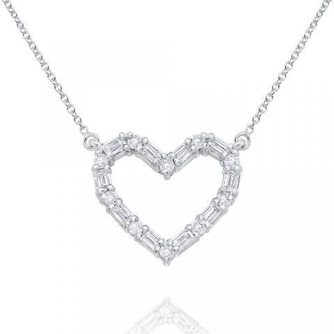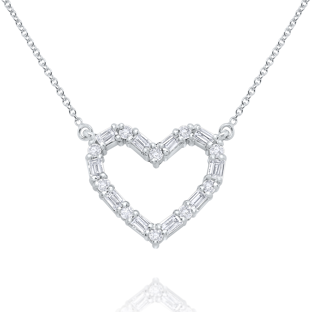Round and baguette diamonds alternate creating this modern heart necklace.