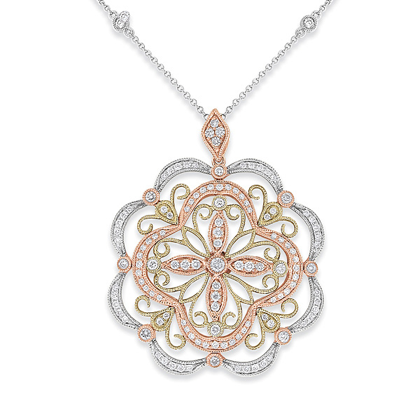 Champagne And White Diamond Fashion Necklace in 14k White, Yellow and Rose Gold with 129 Diamonds weighing .93ct tw.
