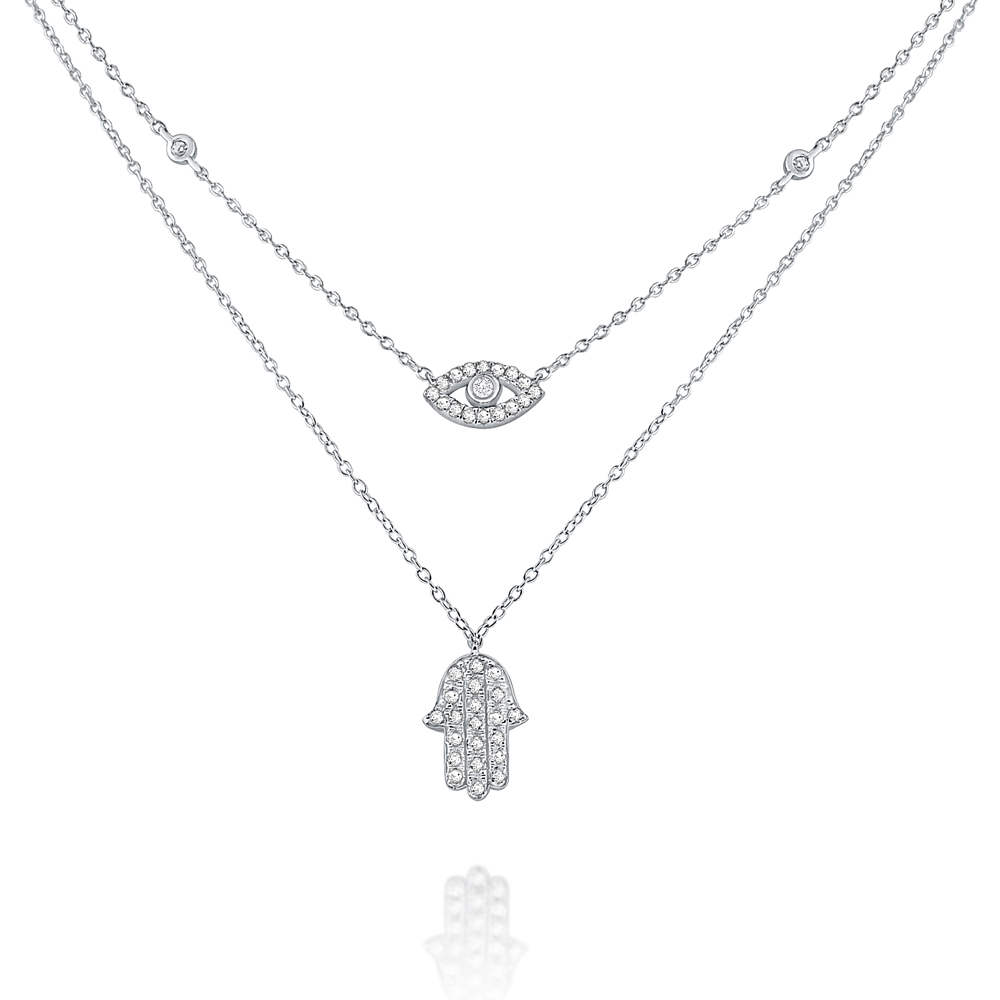 Wear your luck with this gold double layer evil eye and hamsa necklace accented with 40 dazzling diamonds.