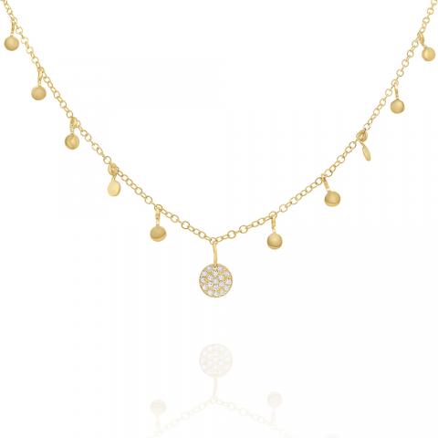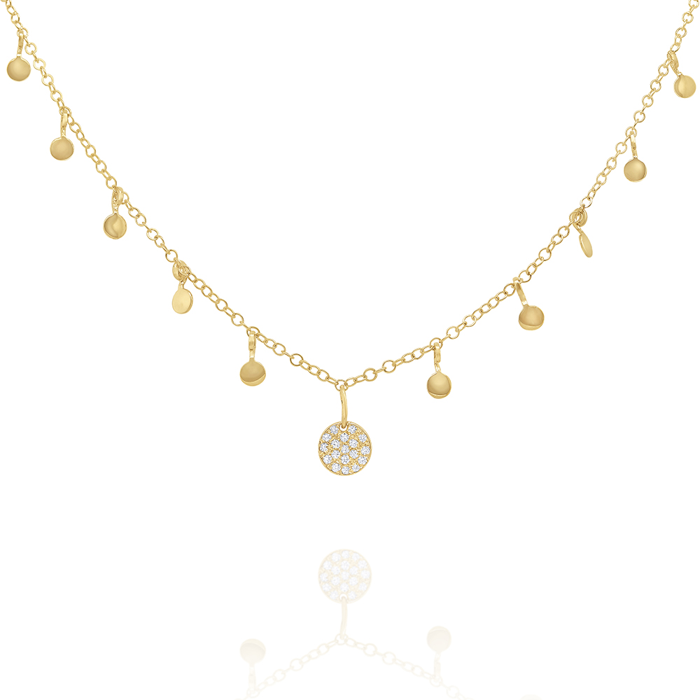 A diamond pave disc is surrounded by drops of playful golden mini discs...the perfect layering necklace for everyday wear.