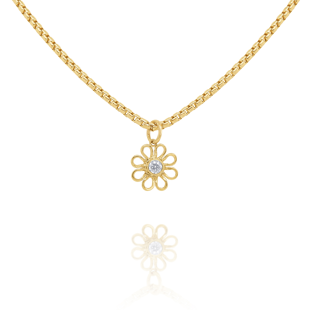 A quarter carat diamond is surrounded by open golden petals creating this fun and flirty flower necklace.
